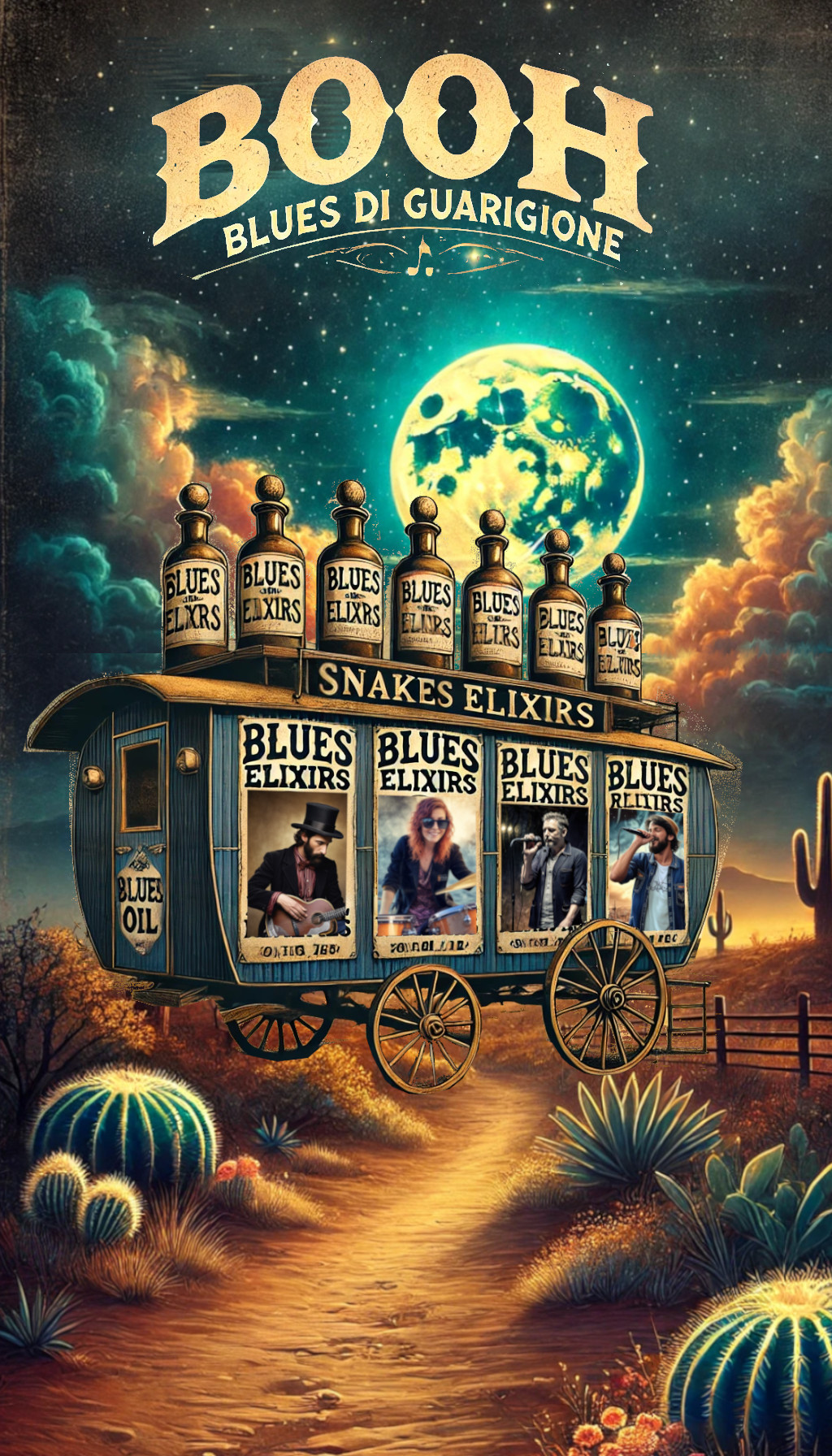 Siamo i BOOH, e non siamo qui per venderti fumo – almeno, non solo. Il nostro blues è un ‘rimedio’ che promette di alleggerire l’anima e raddrizzare la giornata, un po’ come i vecchi venditori di ‘Snake Oil’ del selvaggio West. Con le nostre canzoni, raccontiamo storie, promettiamo guarigioni improbabili e ti coinvolgiamo in un rito che mescola suoni graffianti e parole irresistibili. Vieni a conoscere la banda dei ciarlatani musicali più audaci del panorama blues!